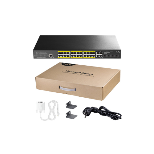 The GS2028PS4 is a rack-mounted 24-GbE, 4-Combo Layer 2 PoE switch, designed for efficient network management and power delivery. It features 24 GbE ports compliant with 802.3at/af PoE, along with 4 GbE/SFP combo ports for versatile connectivity options.